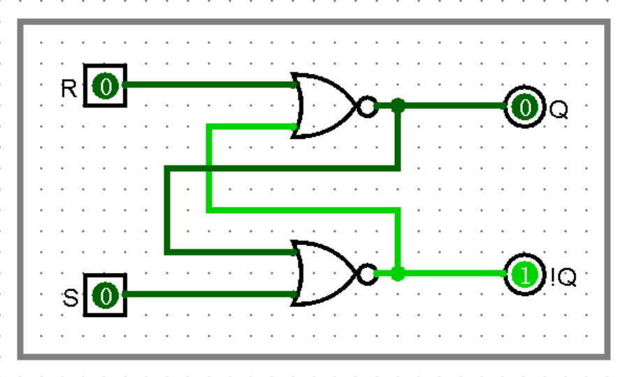 当 S=0,R=0 时,此时或非门就相当于非门,因为另一端输入为 0 不影响或非运算的结果。RS 锁存器将会保持其原本的状态不变,可以存储 1bit 二进制数据。