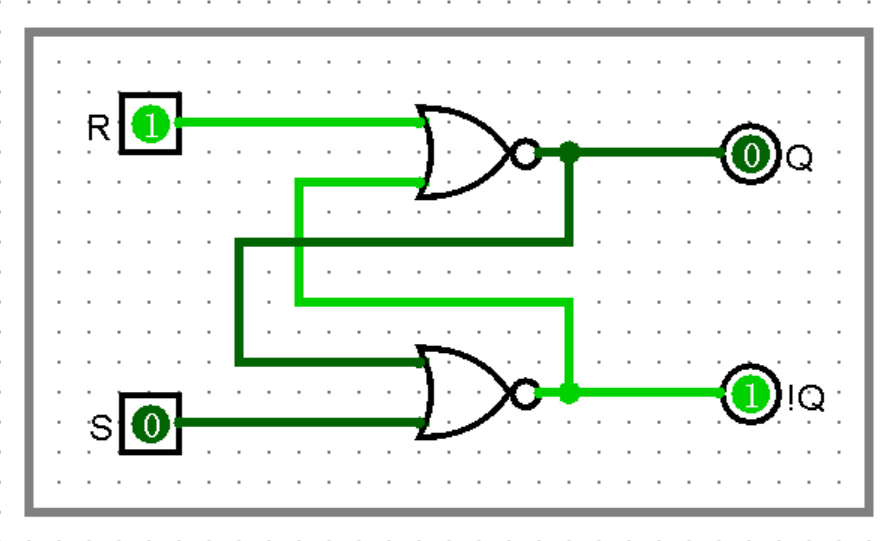 当 S=0,R=1 时,如下图所示。此时 R 端对应的或非门固定输出 0,即 \(Q=0\)。RS 锁存器处于 0 状态。我们称之为复位(Reset)。