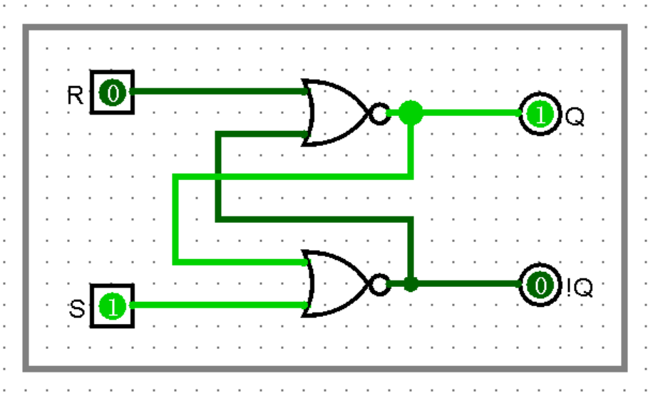 当 S=1,R=0 时,如下图所示,此时 S 端对应的或非门固定输出 0,即 \(\bar{Q}=0,Q=1\)。RS 锁存器处于 1 状态。我们称之为置位(Set)。