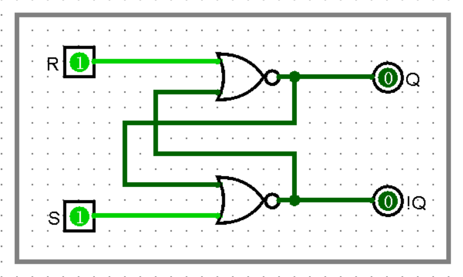 当 S=1,R=1 时,如下图所示,此时 S 端和 R 端对应的或非门都固定输出 0,即 \(Q=0,\bar{Q}=0\)。此时锁存器处于非 0 非 1 的未定义状态,违背了 \(Q\) 和 \(\bar{Q}\) 始终相反的设计初衷。