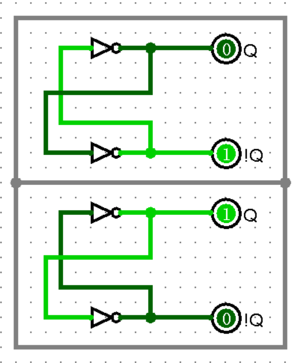 从电路结构可知,若 \(Q=0\),经过下面的非门取反,可得 \(\bar{Q}=1\),再经过上方的非门反馈到输入端,又保证了 \(Q=0\)。由于两个非门首尾相接的逻辑锁定,因而电路能自行保持在 \(Q=0,\bar{Q}=1\) 的状态,对应上方电路的输出结果。反之,若 \(Q=1,\bar{Q}=0\),则对应下方电路的输出结果。