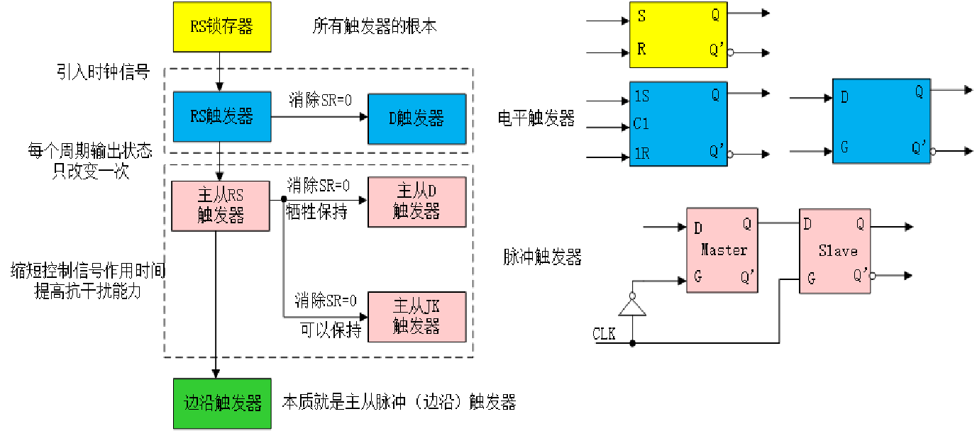 为高电平时,前一个锁存器处于保存状态,此时 D 端输入无法写入前一个锁存器。后一个锁存器处于更新状态,将会写入前一个锁存器的值。这个时候毛刺信号均无法影响到后一个锁存器,因而增强了电路的稳定性。