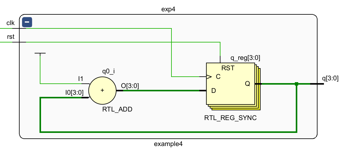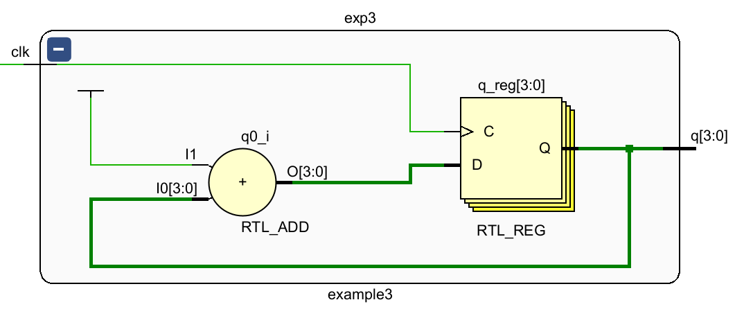 这是一个时序逻辑单元,它应该被综合成一个计数器,每当时钟的上升沿,q 自增一。这段代码在 RTL 综合出的结果如下: