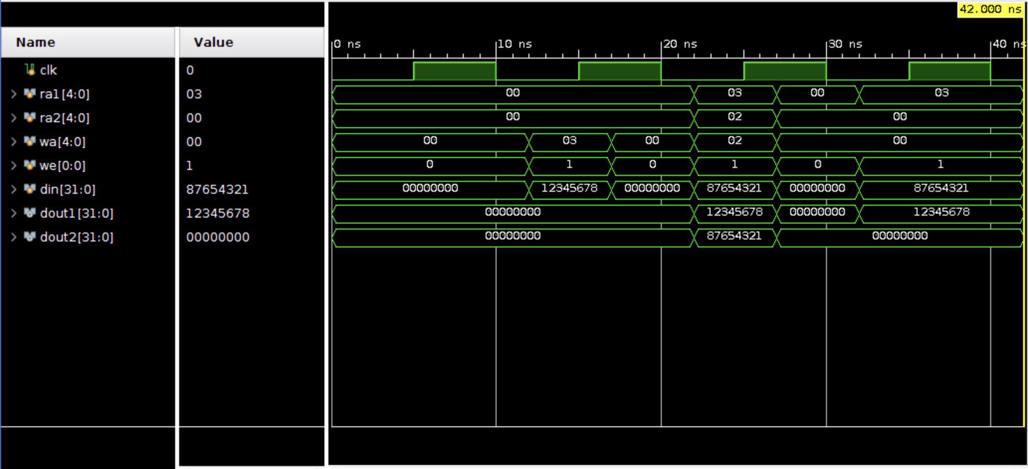 ra1 = 5'H0; ra2 = 5'H0; wa = 5'H3; we = 1'H1; din = 32'H12345678;