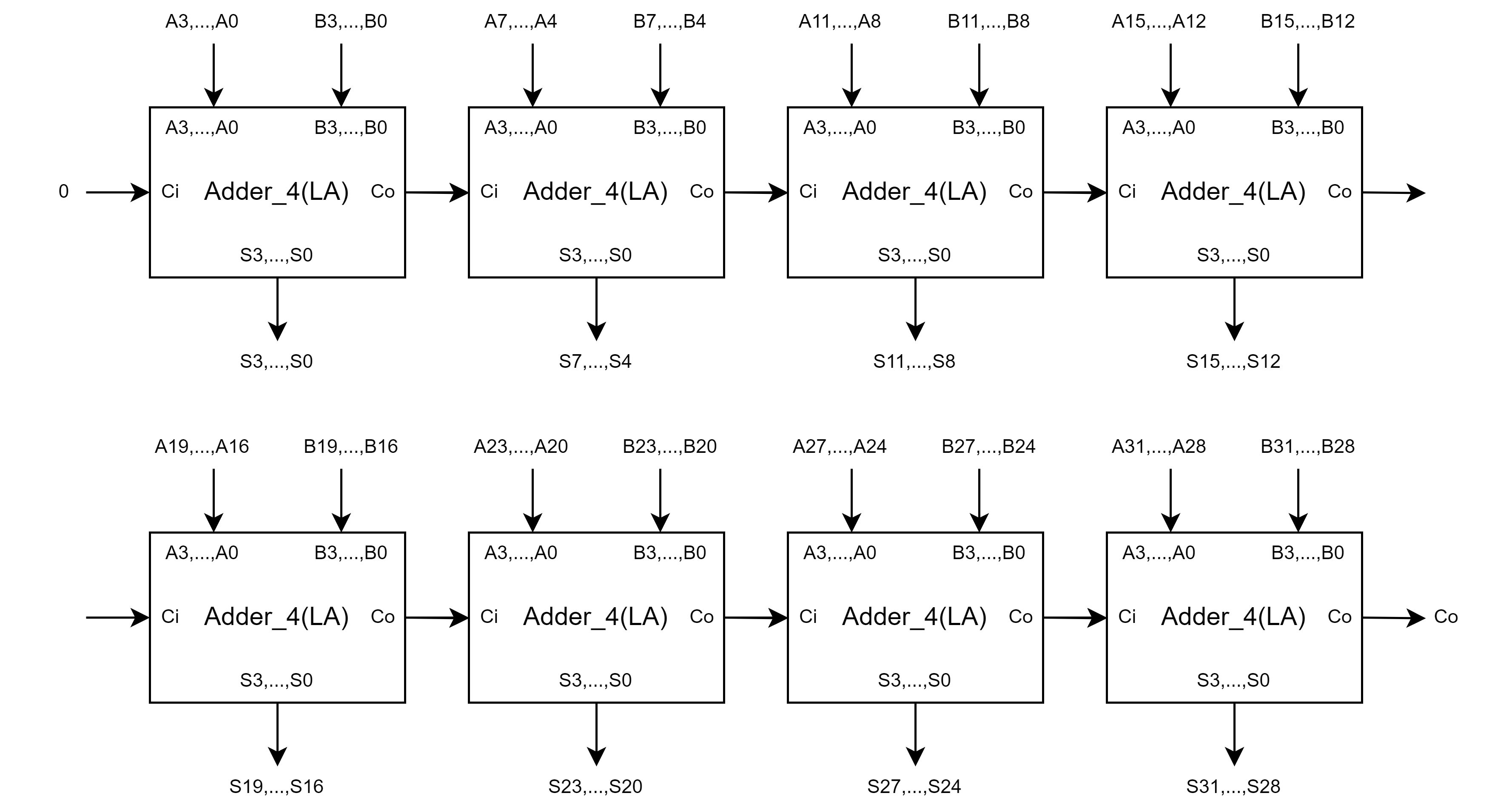 答案是肯定的。我们可以模仿串行进位加法器的思路,将多个超前进位加法器首尾相接串联起来。如果说每个四位超前进位加法器的延迟和资源使用量分别为 T 和 S,那么这种设计就可以以 4S 的资源,换取 4T 的延迟——这将显著优于 32 位的串行加法器。