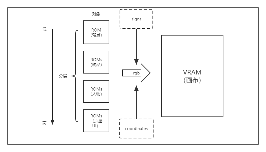 实际的游戏中,不同的对象可能会有不同的显示优先级,例如,背景应该在最底层,人物应该在中间层,UI 应该在最上层。为了实现这一功能,我们可以为每个对象设置一个显示优先级,在画布刷写像素时,使用 if-else 语句,按照优先级从高到低,写入最先符合显示条件的对象的 rgb 信息。