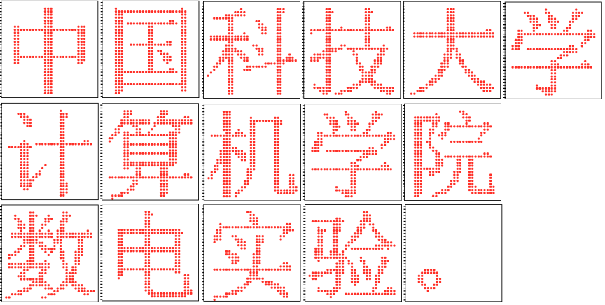 LED 显示屏采用了类似的原理:一块显示屏上有 \(r\times c\) 个 LED 灯,以矩形的方式排列。根据不同位置上 LED 灯的亮起与熄灭不同,我们可以显示不同的图案,其中就包括了汉字。