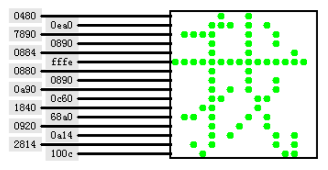 上图为「大」字的字形点阵及编码,你可以自行验证:对于点阵的每一行,右侧的 4 位十六进制数即对应着左侧的 16 位「二进制数」(有点为 1,无点为 0)。