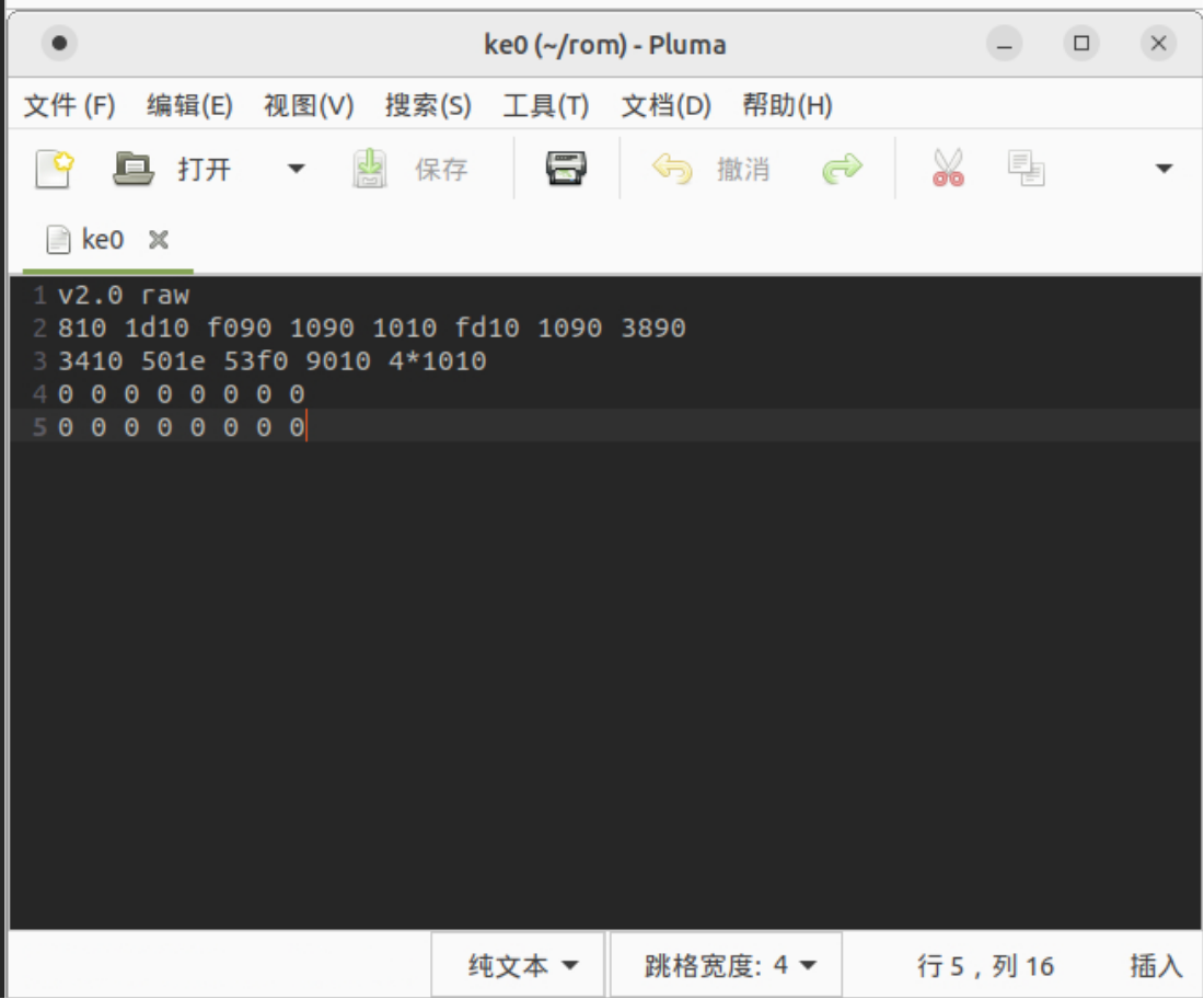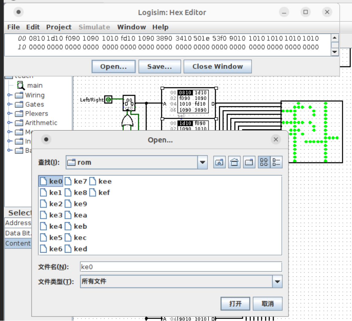ROM 组件位于 Memory 目录下,可定制的内容包括存储单元数目、存储单元位宽以及内部存储的数值。你可以直接点击对应的存储单元,在键盘上输入该单元存储的数值;也可以使用特定的文件进行批量导入。文件开头必须为 v2.0 raw