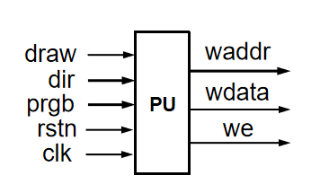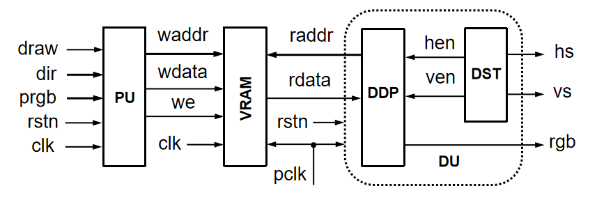 - 绘画 (draw=1) 时,依据 rgb 和 (x, y),通过 VRAM 写端口 (waddr, wdata, we) 存储绘图信息