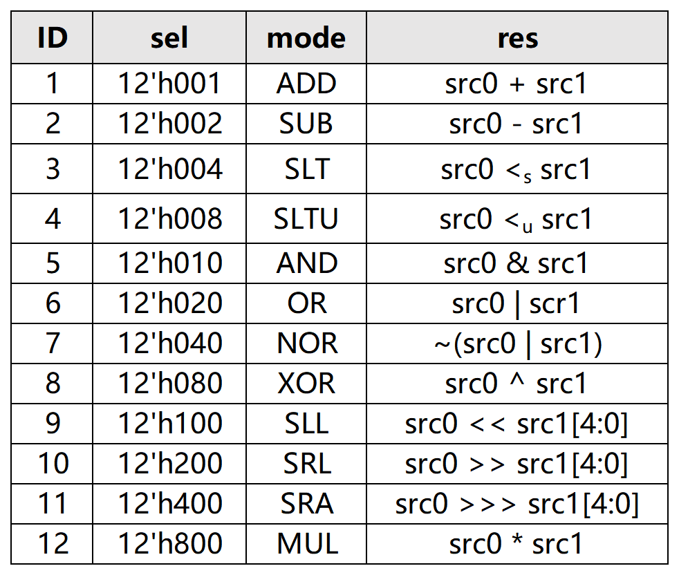 - 各种运算的实现方法与复杂度不限,但应均为组合逻辑(包括乘法运算)。