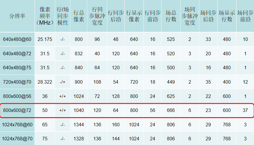 学校的显示屏是 800x600@72Hz 的规格,根据以上表格,可以得到各定时参数的值如下: