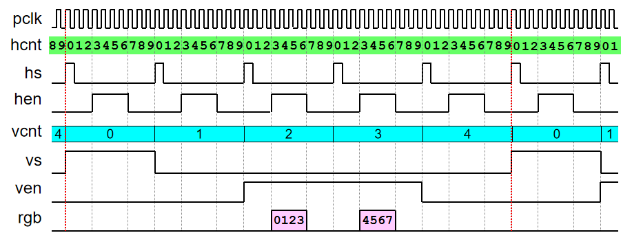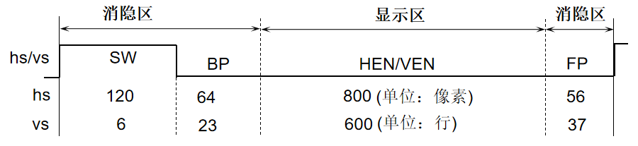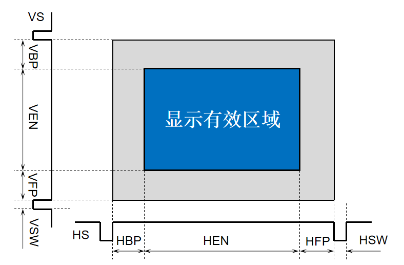 在每一行扫描过程中,电子束会被激活以显示相应像素点的颜色(HEN 段)。每扫描完一行,电子束回到屏幕的左边下一行的起始位置,在此期间,电子束被消隐(HSW、HBP、HFP 段),其中,在 HSW 段还会使用行同步信号进行行同步;扫描完所有的行,即形成一帧(VEN 段),接着电子束回到屏幕左上角,在此期间消隐电子束(VSW、VBP、VFP 段),并在 VSW 段用场同步信号进行场同步。